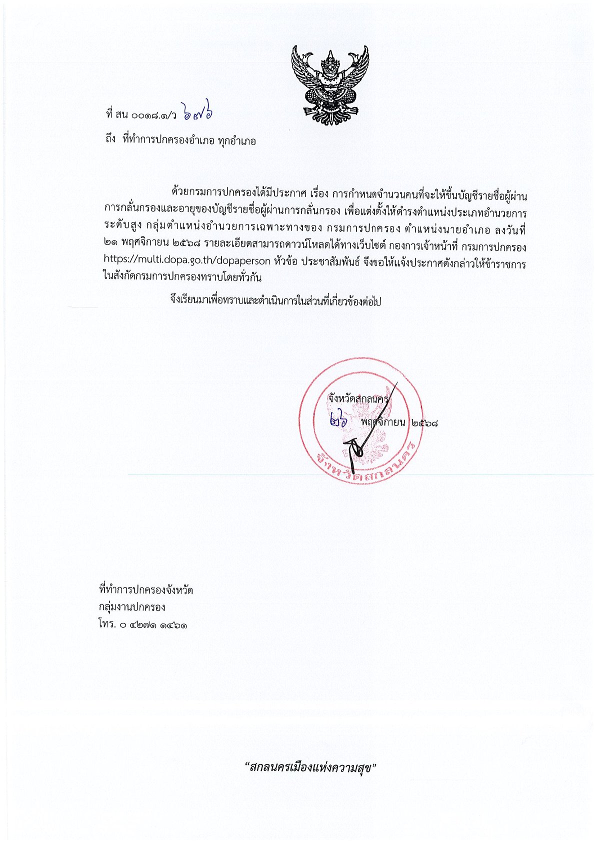 ที่ สน 0018.1/ว 767 ลงวันที่ 26 พฤศจิกายน 2568 เรียน ที่ทำการปกครองอำเภอ ทุกอำเภอ เรื่อง การกำหนดจำนวนคนที่จะให้ขึ้นบัญชีรายชื่อผู้ผ่านการกลั่นกรองและอายุของบัญชีรายชื่อผู้ผ่านการกลั่นกรอง เพื่อแต่งตั้งให้ดำรงตำแหน่งประเภทอำนวยการ ระดับสูง กลุ่มตำแหน่งอำนวยการเฉพาะทางของ กรมการปกครอง ตำแหน่งนายอำเภอ