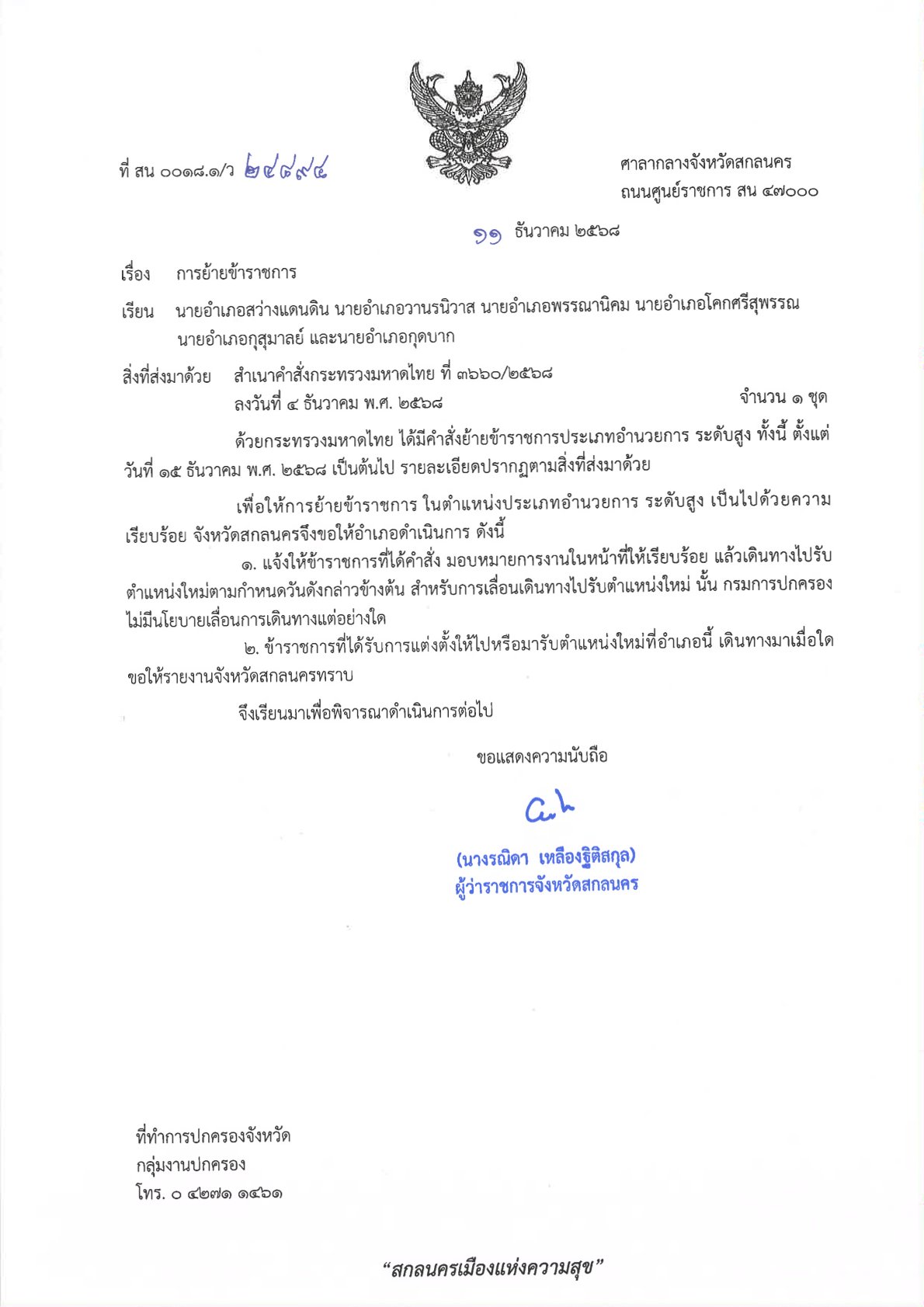 ที่ สน 0018.1/ว 24894 ลงวันที่ 11 ธันวาคม 2568 เรียน นายอำเภอสว่างแดนดิน นายอำเภอวานรนิวาส นายอำเภอพรรณานิคม นายอำเภอโคกศรีสุพรรณ นายอำเภอกุสุมาลย์ และนายอำเภอกุดบาก เรื่อง การย้ายข้าราชการ