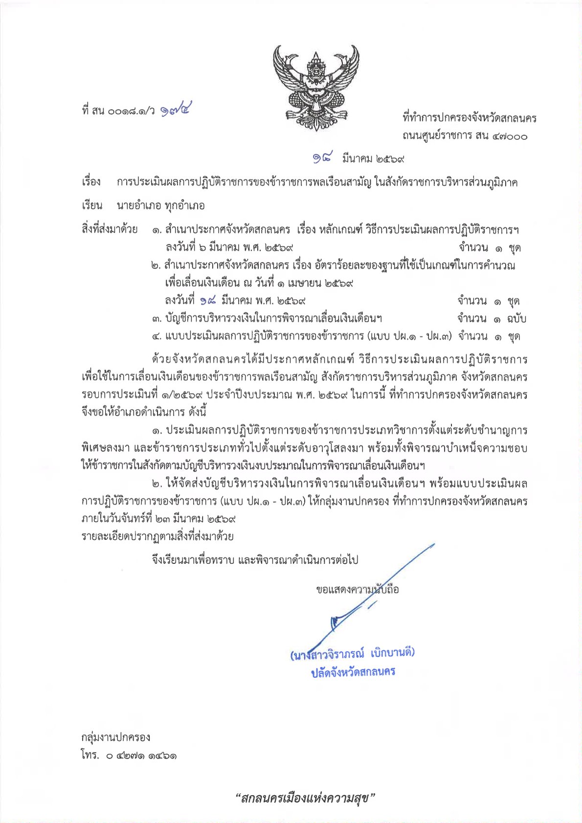 ที่ สน 0018.1/ว 174 ลงวันที่ 18 มีนาคม 2569 เรียน นายอำเภอ ทุกอำเภอ เรื่อง การประเมินผลการปฏิบัติราชการของข้าราชการพลเรือนสามัญ ในสังกัดราชการบริหารส่วนภูมิภาค