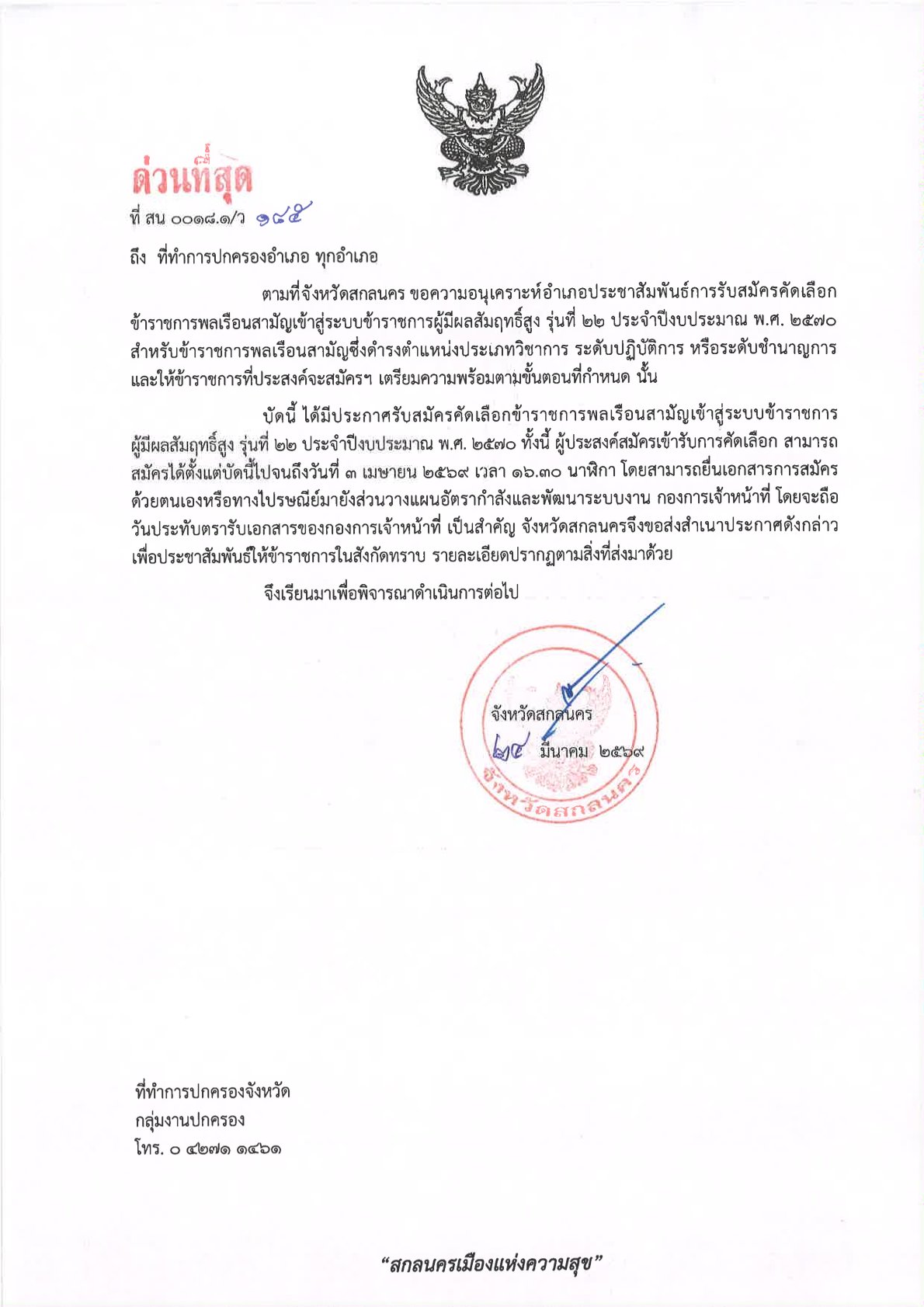 ด่วนที่สุด ที่ สน 0018.1/ว 185 ลงวันที่ 24 มีนาคม 2569 เรียน ที่ทำการปกครองอำเภอ ทุกอำเภอ เรื่อง การรับสมัครคัดเลือกข้าราชการพลเรือนสามัญเข้าสู่ระบบข้าราชการผู้มีผลสัมฤทธิ์สูง รุ่นที่ 22 ประจำปีงบประมาณ พ.ศ. 2570 DopaAdmin24 มีนาคม 26กลุ่มงานปกครอง, ประกาศ/ระเบียบ/ดาวน์โหลดด่วนที่สุด ที่ สน 0018.1/ว 185 ลงวันที่ 24 มีนาคม 2569 เรียน ที่ทำการปกครองอำเภอ ทุกอำเภอ เรื่อง การรับสมัครคัดเลือกข้าราชการพลเรือนสามัญเข้าสู่ระบบข้าราชการผู้มีผลสัมฤทธิ์สูง รุ่นที่ 22 ประจำปีงบประมาณ พ.ศ. 2570 http://dopasakonnakhon.go.th/home/wp-content/uploads/2026/03/2.แจ้งทุกอำเภอประกาศรับสมัครคัดเลือกข้าราชการ-ผู้มีผลสัมฤทธิ์สูง-ปี-70.pdf อ่านแล้ว : 0 FacebookFacebookXXLINELine ใส่ความเห็น ยกเลิกการตอบอีเมลของคุณจะไม่แสดงให้คนอื่นเห็น ช่องข้อมูลจำเป็นถูกทำเครื่องหมาย *ชื่อ * อีเมล * เว็บไซต์ ความเห็น * บันทึกชื่อ, อีเมล และชื่อเว็บไซต์ของฉันบนเบราว์เซอร์นี้ สำหรับการแสดงความเห็นครั้งถัดไป