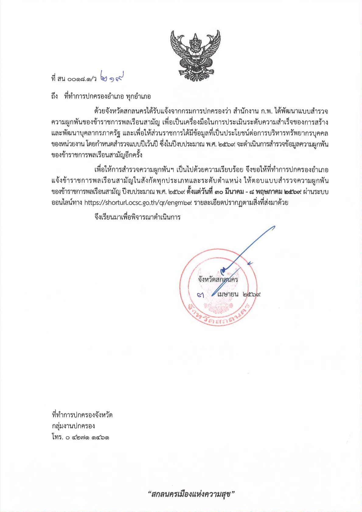 ที่ สน 0018.1/ว 219 ลงวันที่ 3 เมษายน 2569 เรียน ที่ทำการปกครองอำเภอ ทุกอำเภอ เรื่อง การตอบแบบสำรวจความผูกพันของข้าราชการพลเรือนสามัญ ปีงบประมาณ พ.ศ. 2569 DopaAdmin3 เมษายน 26กลุ่มงานปกครอง, ประกาศ/ระเบียบ/ดาวน์โหลดที่ สน 0018.1/ว 219 ลงวันที่ 3 เมษายน 2569 เรียน ที่ทำการปกครองอำเภอ ทุกอำเภอ เรื่อง การตอบแบบสำรวจความผูกพันของข้าราชการพลเรือนสามัญ ปีงบประมาณ พ.ศ. 2569 http://dopasakonnakhon.go.th/home/wp-content/uploads/2026/04/แจ้ง-ทุกอำเภอ-การตอบแบบสำรวจความผูกพันของข้าราชการพลเรือนสามัญ-ปีงบประมาณ-พ.ศ.-2569.pdf อ่านแล้ว : 0 FacebookFacebookXXLINELine ใส่ความเห็น ยกเลิกการตอบอีเมลของคุณจะไม่แสดงให้คนอื่นเห็น ช่องข้อมูลจำเป็นถูกทำเครื่องหมาย *ชื่อ * อีเมล * เว็บไซต์ ความเห็น * บันทึกชื่อ, อีเมล และชื่อเว็บไซต์ของฉันบนเบราว์เซอร์นี้ สำหรับการแสดงความเห็นครั้งถัดไป