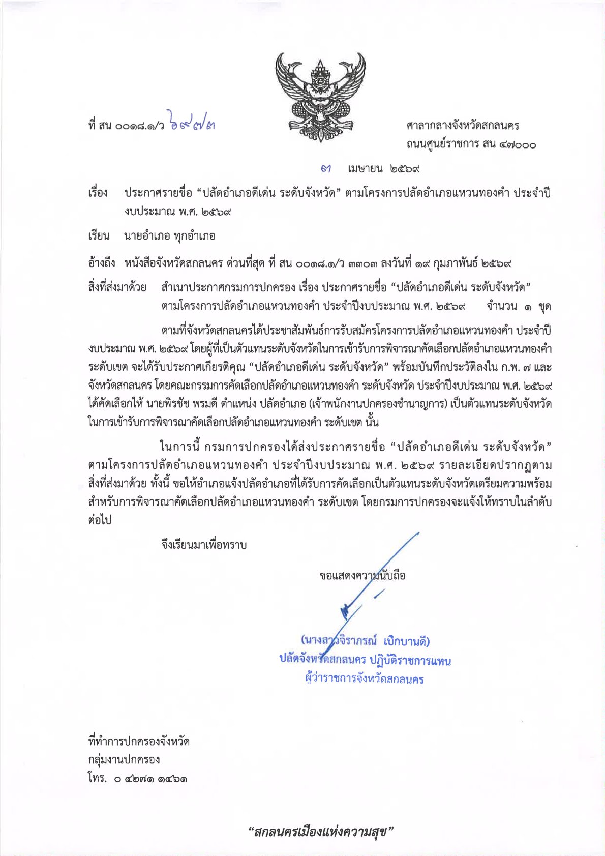ที่ สน 0018.1/ว 6973 ลงวันที่ 3 เมษายน 2569 เรียน นายอำเภอ ทุกอำเภอ เรื่อง ประกาศรายชื่อ “ปลัดอำเภอดีเด่น ระดับจังหวัด” ตามโครงการปลัดอำเภอแหวนทองคำ ประจำปีงบประมาณ พ.ศ. 2569 DopaAdmin3 เมษายน 26กลุ่มงานปกครอง, ประกาศ/ระเบียบ/ดาวน์โหลดแจ้งทุกอำเภอประกาศรายชื่อปลัดอำเภอฯ-ตามโครงการปลัดอำเภอแหวนทองคำ-ปรงบฯ-69 http://dopasakonnakhon.go.th/home/wp-content/uploads/2026/04/แจ้งทุกอำเภอประกาศรายชื่อปลัดอำเภอฯ-ตามโครงการปลัดอำเภอแหวนทองคำ-ปรงบฯ-69.pdf อ่านแล้ว : 0 FacebookFacebookXXLINELine ใส่ความเห็น ยกเลิกการตอบอีเมลของคุณจะไม่แสดงให้คนอื่นเห็น ช่องข้อมูลจำเป็นถูกทำเครื่องหมาย *ชื่อ * อีเมล * เว็บไซต์ ความเห็น * บันทึกชื่อ, อีเมล และชื่อเว็บไซต์ของฉันบนเบราว์เซอร์นี้ สำหรับการแสดงความเห็นครั้งถัดไป