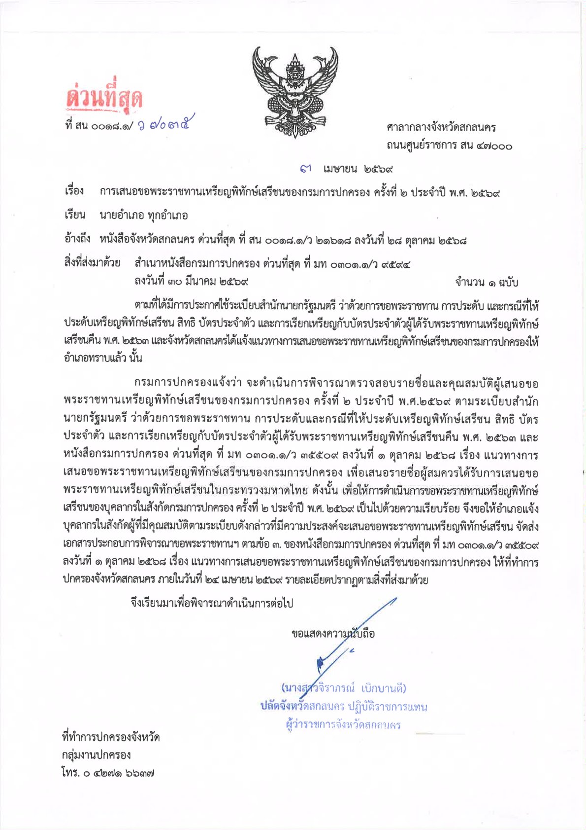 ด่วนที่สุด ที่ สน 0018.1/ว 7035 ลงวันที่ 3 เมษายน 2569 เรียน นายอำเภอ ทุกอำเภอ เรื่อง การเสนอขอพระราชทานเหรียญพิทักษ์เสรีชนของกรมการปกครอง ครั้งที่ 2 ประจำปี พ.ศ. 2569 DopaAdmin3 เมษายน 26กลุ่มงานปกครอง, ประกาศ/ระเบียบ/ดาวน์โหลดด่วนที่สุด ที่ สน 0018.1/ว 7035 ลงวันที่ 3 เมษายน 2569 เรียน นายอำเภอ ทุกอำเภอ เรื่อง การเสนอขอพระราชทานเหรียญพิทักษ์เสรีชนของกรมการปกครอง ครั้งที่ 2 ประจำปี พ.ศ. 2569 http://dopasakonnakhon.go.th/home/wp-content/uploads/2026/04/แจ้ง-ทุกอำเภอ-การเสนอขอเหรียญเสรีชน-ครั้งที่-2-ปี-69.pdf อ่านแล้ว : 0 FacebookFacebookXXLINELine ใส่ความเห็น ยกเลิกการตอบอีเมลของคุณจะไม่แสดงให้คนอื่นเห็น ช่องข้อมูลจำเป็นถูกทำเครื่องหมาย *ชื่อ * อีเมล * เว็บไซต์ ความเห็น * บันทึกชื่อ, อีเมล และชื่อเว็บไซต์ของฉันบนเบราว์เซอร์นี้ สำหรับการแสดงความเห็นครั้งถัดไป