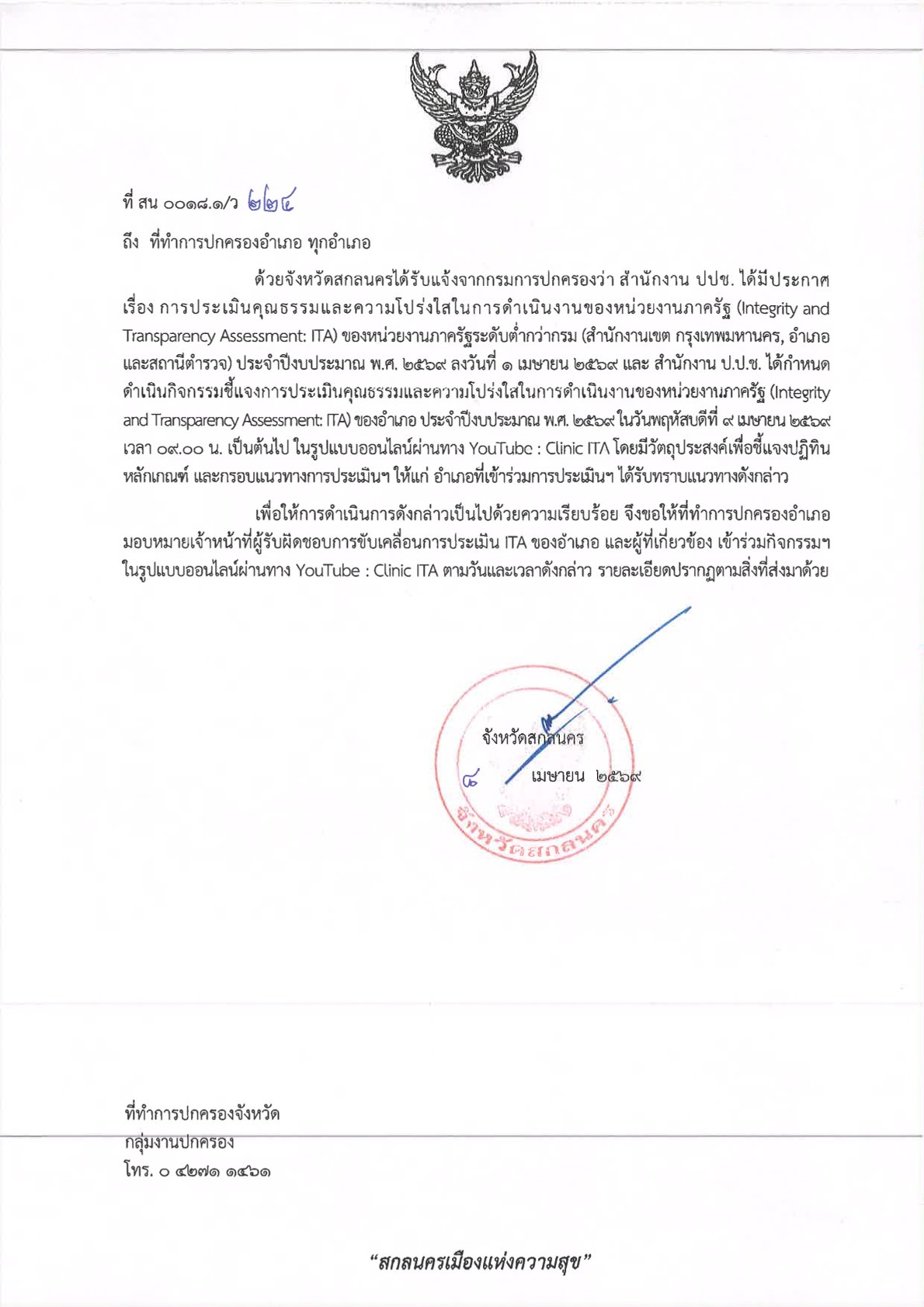 ที่ สน 0018.1/ว 224 ลงวันที่ 8 เมษายน 2569 เรียน ที่ทำการปกครองอำเภอ ทุกอำเภอ เรื่อง กิจกรรมชี้แจงการประเมินคุณธรรมและความโปร่งใสในการดำเนินงานของหน่วยงานภาครัฐ (Integrity and Transparency Assessment: ITA) ของอำเภอ ปีงบประมาณ พ.ศ. 2569 DopaAdmin9 เมษายน 26กลุ่มงานปกครอง, ประกาศ/ระเบียบ/ดาวน์โหลดที่ สน 0018.1/ว 224 ลงวันที่ 8 เมษายน 2569 เรียน ที่ทำการปกครองอำเภอ ทุกอำเภอ เรื่อง กิจกรรมชี้แจงการประเมินคุณธรรมและความโปร่งใสในการดำเนินงานของหน่วยงานภาครัฐ (Integrity and Transparency Assessment: ITA) ของอำเภอ ปีงบประมาณ พ.ศ. 2569 http://dopasakonnakhon.go.th/home/wp-content/uploads/2026/04/แจ้ง-ทุกอำเภอ-การประชุมรูปแบบออนไลน์-ITA.pdf อ่านแล้ว : 0 FacebookFacebookXXLINELine ใส่ความเห็น ยกเลิกการตอบอีเมลของคุณจะไม่แสดงให้คนอื่นเห็น ช่องข้อมูลจำเป็นถูกทำเครื่องหมาย *ชื่อ * อีเมล * เว็บไซต์ ความเห็น * บันทึกชื่อ, อีเมล และชื่อเว็บไซต์ของฉันบนเบราว์เซอร์นี้ สำหรับการแสดงความเห็นครั้งถัดไป