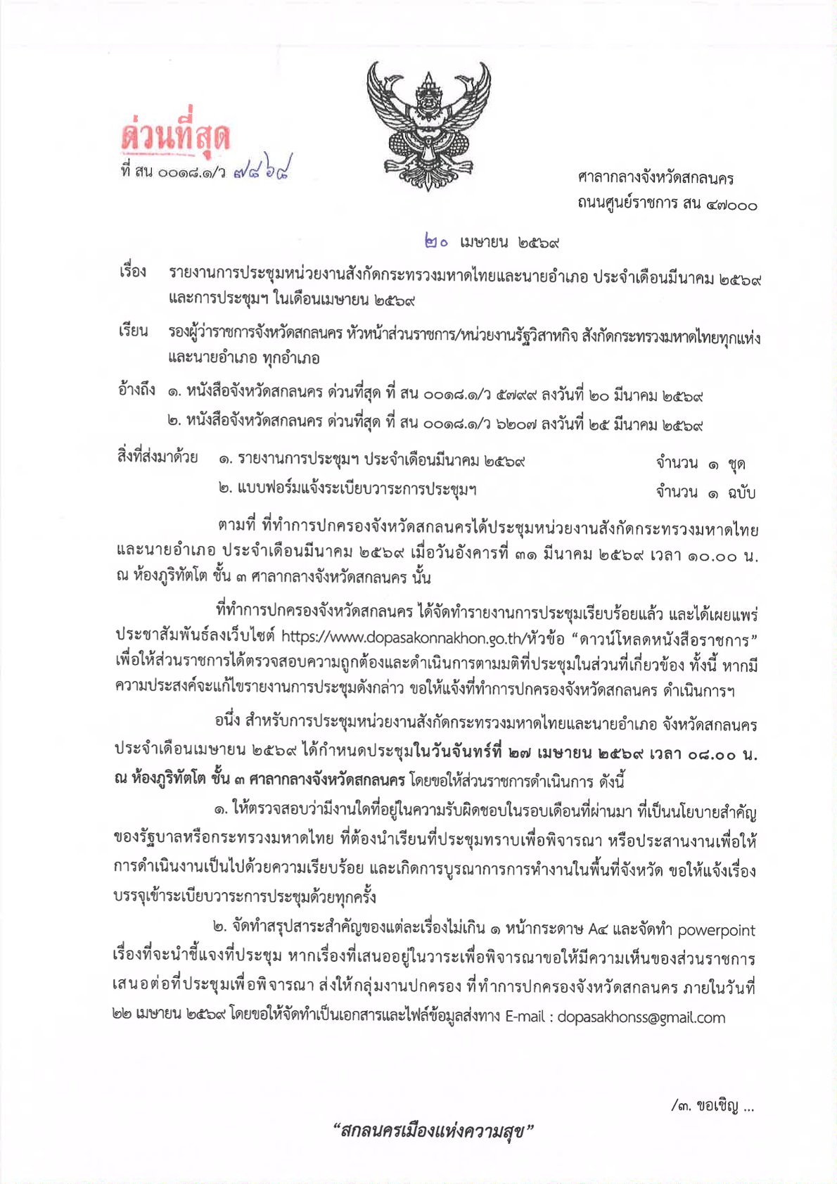 ด่วนที่สุด ที่ สน 0018.1/ว 7868 ลงวันที่ 20 เมษายน 2569 เรียน รองผู้ว่าราชการจังหวัดสกลนคร หัวหน้าส่วนราชการ/หน่วยงานรัฐวิสาหกิจ สังกัดกระทรวงมหาดไทยทุกแห่ง และนายอำเภอ ทุกอำเภอ เรื่อง รายงานการประชุมหน่วยงานสังกัดกระทรวงมหาดไทยและนายอำเภอ ประจำเดือนมีนาคม 2569 และการประชุมฯ ในเดือนเมษายน 2569 DopaAdmin20 เมษายน 26กลุ่มงานปกครอง, ประกาศ/ระเบียบ/ดาวน์โหลดด่วนที่สุด ที่ สน 0018.1/ว 7868 ลงวันที่ 20 เมษายน 2569 เรียน รองผู้ว่าราชการจังหวัดสกลนคร หัวหน้าส่วนราชการ/หน่วยงานรัฐวิสาหกิจ สังกัดกระทรวงมหาดไทยทุกแห่ง และนายอำเภอ ทุกอำเภอ เรื่อง รายงานการประชุมหน่วยงานสังกัดกระทรวงมหาดไทยและนายอำเภอ ประจำเดือนมีนาคม 2569 และการประชุมฯ ในเดือนเมษายน 2569 http://dopasakonnakhon.go.th/home/wp-content/uploads/2026/04/เชิญประชุม-มท.นอ.-27-เม.ย.-69.pdf อ่านแล้ว : 0 FacebookFacebookXXLINELine ใส่ความเห็น ยกเลิกการตอบอีเมลของคุณจะไม่แสดงให้คนอื่นเห็น ช่องข้อมูลจำเป็นถูกทำเครื่องหมาย *ชื่อ * อีเมล * เว็บไซต์ ความเห็น * บันทึกชื่อ, อีเมล และชื่อเว็บไซต์ของฉันบนเบราว์เซอร์นี้ สำหรับการแสดงความเห็นครั้งถัดไป