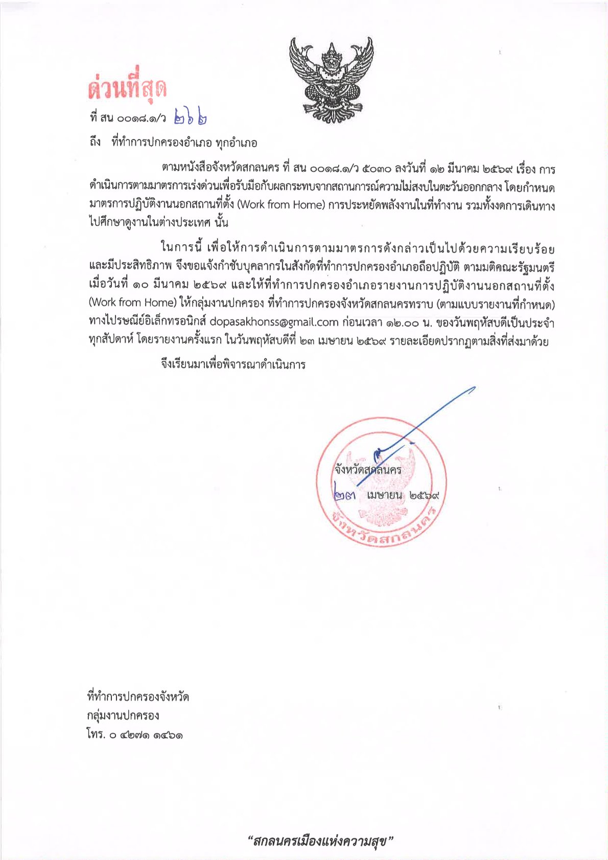 ด่วนที่สุด ที่ สน 0018.1/ว 262 ลงวันที่ 23 เมษายน 2569 เรียน ที่ทำการปกครองอำเภอ ทุกอำเภอ เรื่อง การปฏิบัติงานนอกสถานที่ตั้ง (Work from Home) DopaAdmin23 เมษายน 26กลุ่มงานปกครอง, ประกาศ/ระเบียบ/ดาวน์โหลดด่วนที่สุด ที่ สน 0018.1/ว 262 ลงวันที่ 23 เมษายน 2569 เรียน ที่ทำการปกครองอำเภอ ทุกอำเภอ เรื่อง การปฏิบัติงานนอกสถานที่ตั้ง (Work from Home) http://dopasakonnakhon.go.th/home/wp-content/uploads/2026/04/แจ้ง-ทุกอำเภอ-รายงานการปฏิบัติงานนอกสถานที่ตั้ง-Work-from-Home.pdf อ่านแล้ว : 0 FacebookFacebookXXLINELine ใส่ความเห็น ยกเลิกการตอบอีเมลของคุณจะไม่แสดงให้คนอื่นเห็น ช่องข้อมูลจำเป็นถูกทำเครื่องหมาย *ชื่อ * อีเมล * เว็บไซต์ ความเห็น * บันทึกชื่อ, อีเมล และชื่อเว็บไซต์ของฉันบนเบราว์เซอร์นี้ สำหรับการแสดงความเห็นครั้งถัดไป