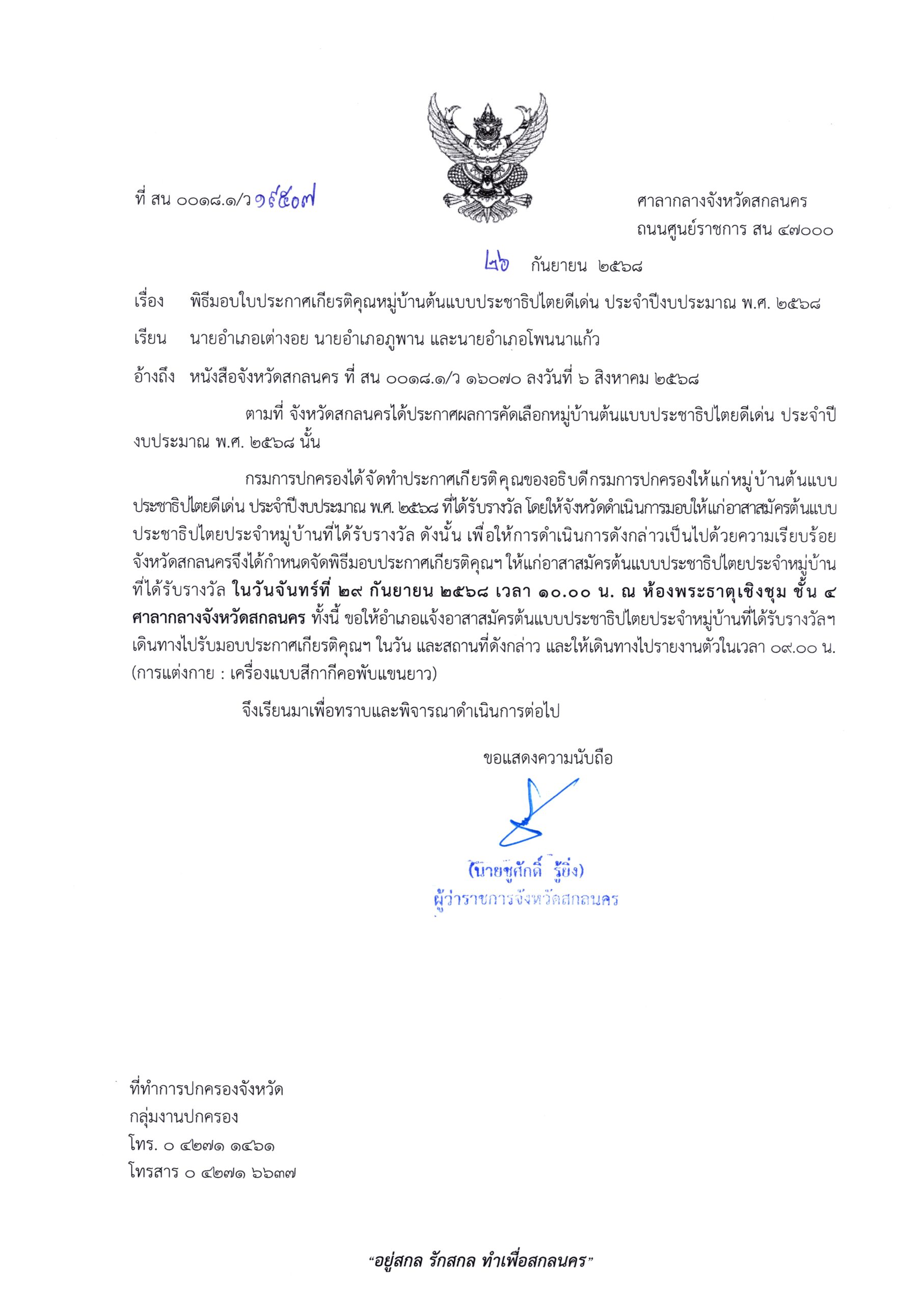 ที่ สน 0018.1/ว19507 ลงวันที่ 26 กันยายน 2568 เรียน นายอำเภอเต่างอย นายอำเภอภูพาน และนายอำเภอโพนนาแก้ว เรื่อง พิธีมอบใบประกาศเกียรติคุณหมู่บ้านต้นแบบประชาธิปไตยดีเด่น ประจำปีงบประมาณ พ.ศ. 2568ดาวน์โหลดที่ สน 0018.1/ว19507 ลงวันที่ 26 กันยายน 2568 เรียน นายอำเภอเต่างอย นายอำเภอภูพาน และนายอำเภอโพนนาแก้ว เรื่อง พิธีมอบใบประกาศเกียรติคุณหมู่บ้านต้นแบบประชาธิปไตยดีเด่น ประจำปีงบประมาณ พ.ศ. 2568