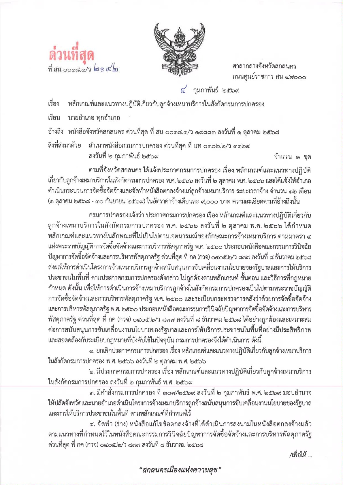 ด่วนที่สุด ที่ สน 0018.1/ว 2192 ลงวันที่ 4 กุมภาพันธ์ 2569 เรียน นายอำเภอ ทุกอำเภอ เรื่อง หลักเกณฑ์และแนวทางปฏิบัติเกี่ยวกับลูกจ้างเหมาบริการในสังกัดกรมการปกครอง